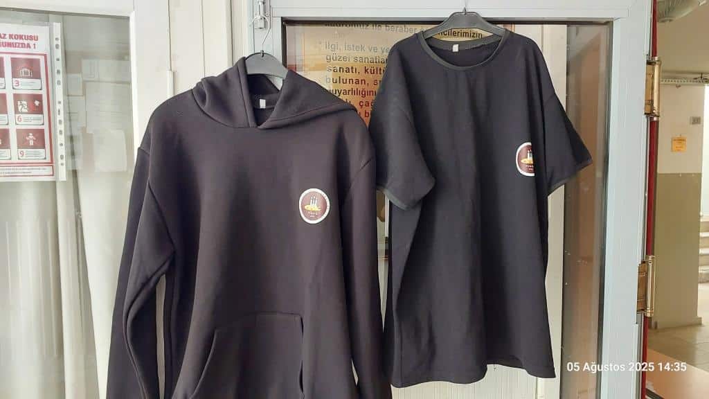 Okul logosunun basılmış olduğu tişört ve kapuşönlü uzun kollu sweat